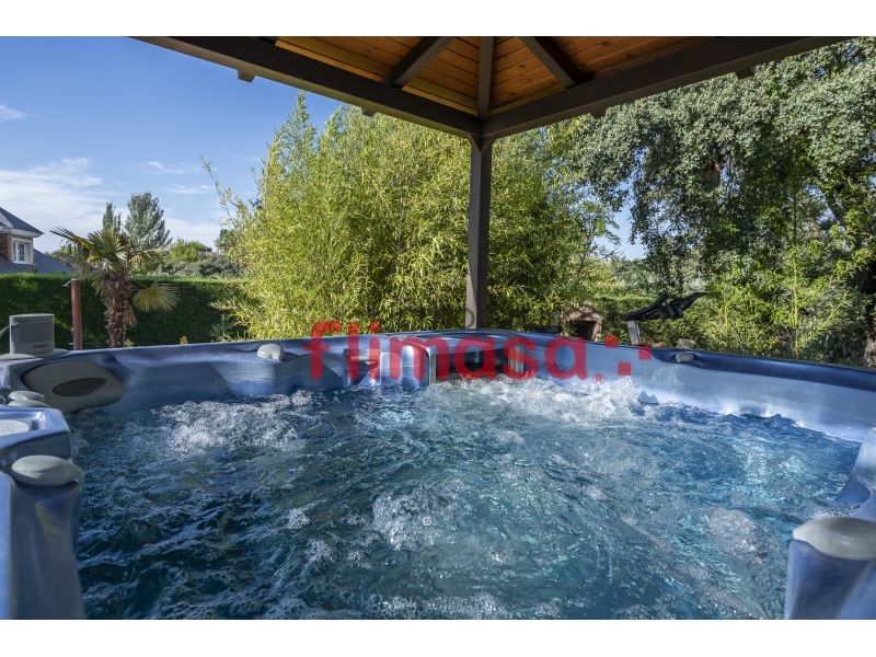 El jardín es uno de los grandes protagonistas: una parcela cuidada al detalle con encinas, prunos, magnolio, laurel y una gran colección de rosales ingleses que llenan el espacio de color y aroma. La piscina de 5x10 metros con cloración salina, spa, zona chill-out con bar, barbacoa y caseta de aperos es ideal para desconectar o compartir momentos inolvidables con familia y amigos.