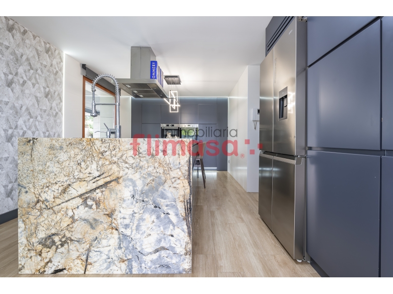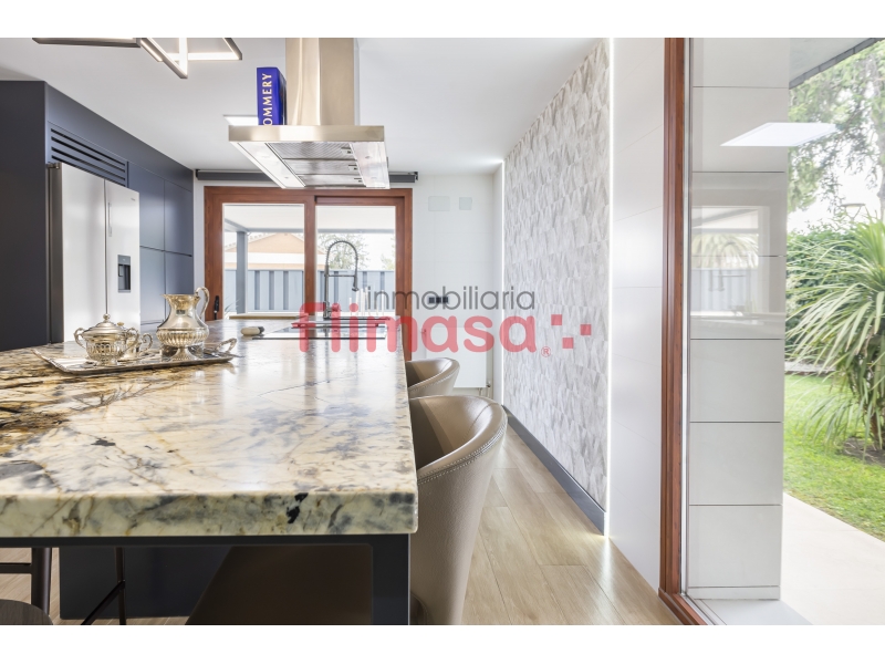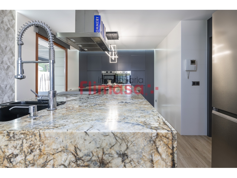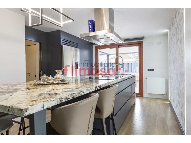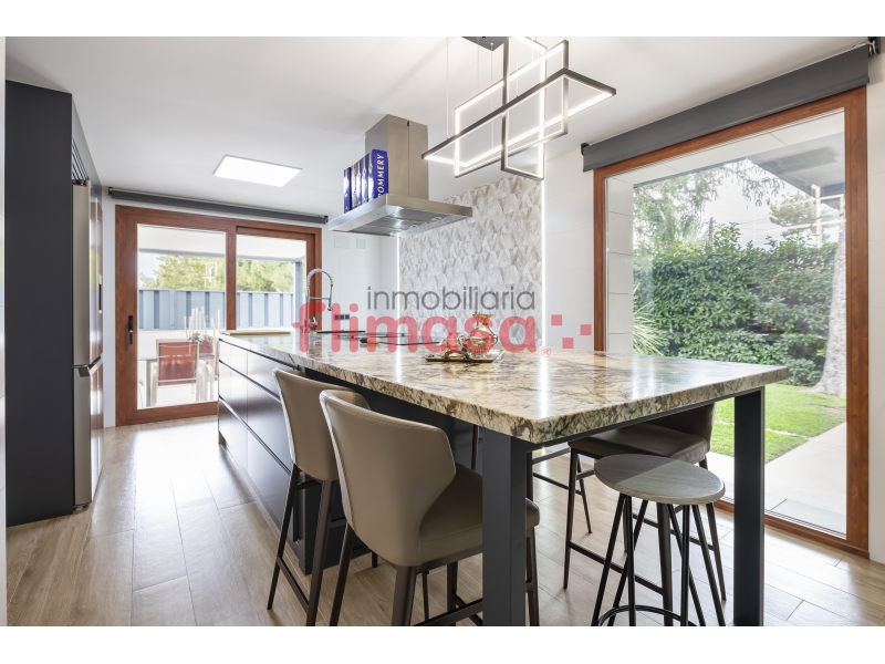 En la planta principal, el gran salón de casi 100 m², distribuido en tres ambientes y con chimenea, se convierte en el corazón de la vivienda, perfecto para disfrutar en familia o con invitados. La cocina, completamente reformada, cuenta con isla central de granito internacional y salida directa a un espectacular porche con pérgola bioclimática, ideal para vivir el exterior durante todo el año.