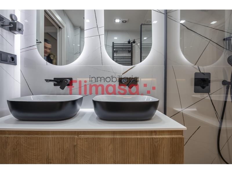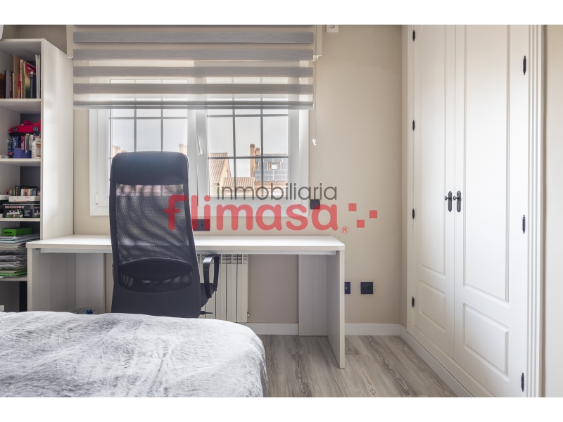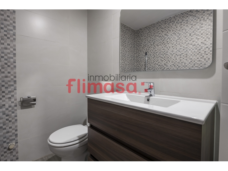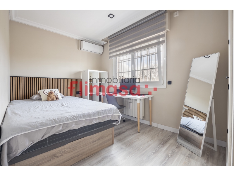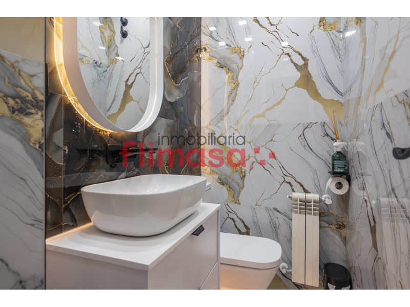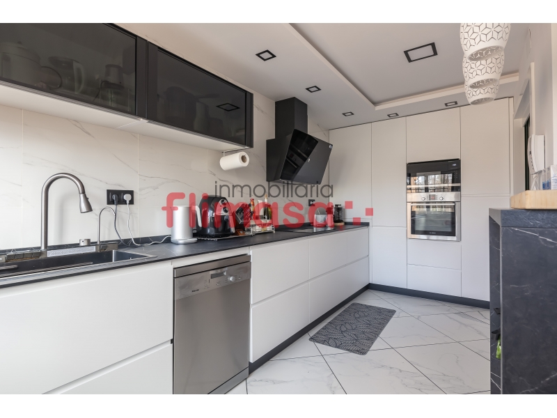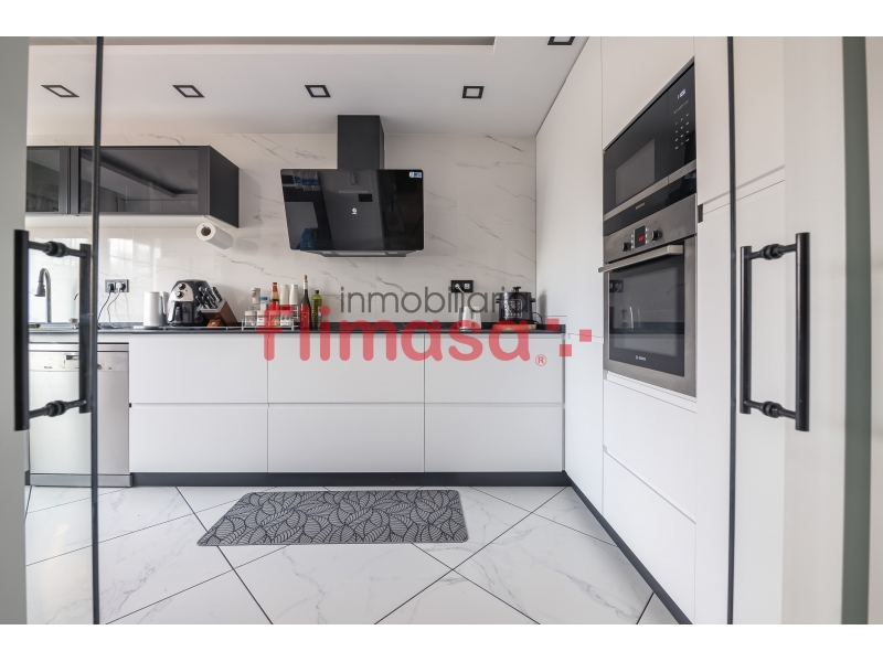 La cocina, completamente reformada, destaca por su diseño moderno y funcional, con puerta corredera. En esta misma planta encontramos un dormitorio, perfecto como habitación de invitados, despacho o dormitorio en planta calle, además de un aseo de cortesía.