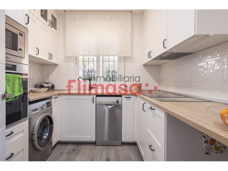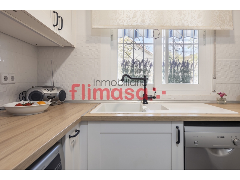 La cocina, completamente reformada y amueblada, resulta práctica y funcional para el día a día. En esta misma planta también hay un aseo actualizado y un porche con toldo.