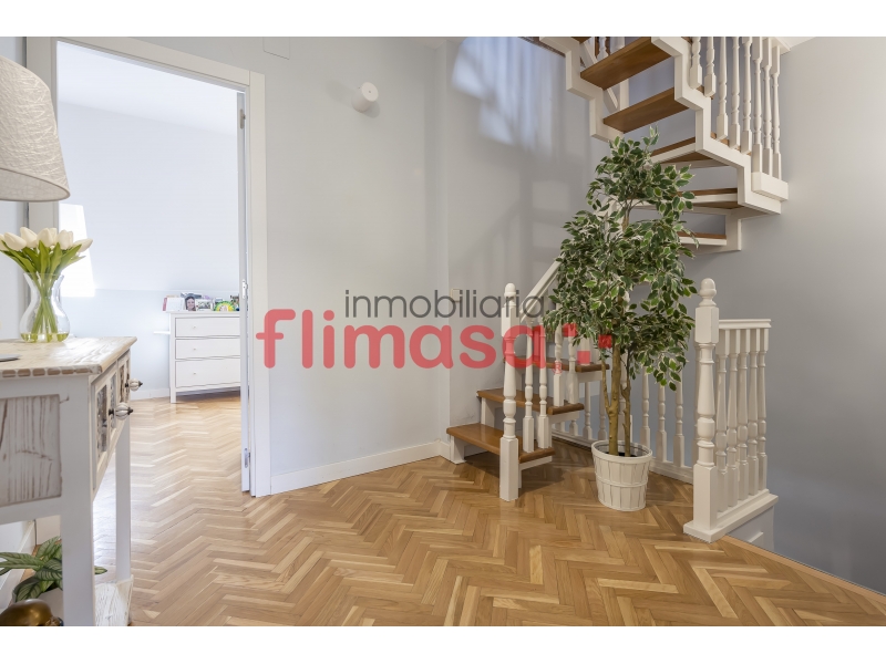 En cuanto a calidades, destacan los suelos de tarima y parquet en tonos roble, ventanas de PVC oscilobatientes con rotura de puente térmico, puertas lacadas en blanco, calefacción individual de gas natural y aire acondicionado en salón, dormitorios y buhardilla.